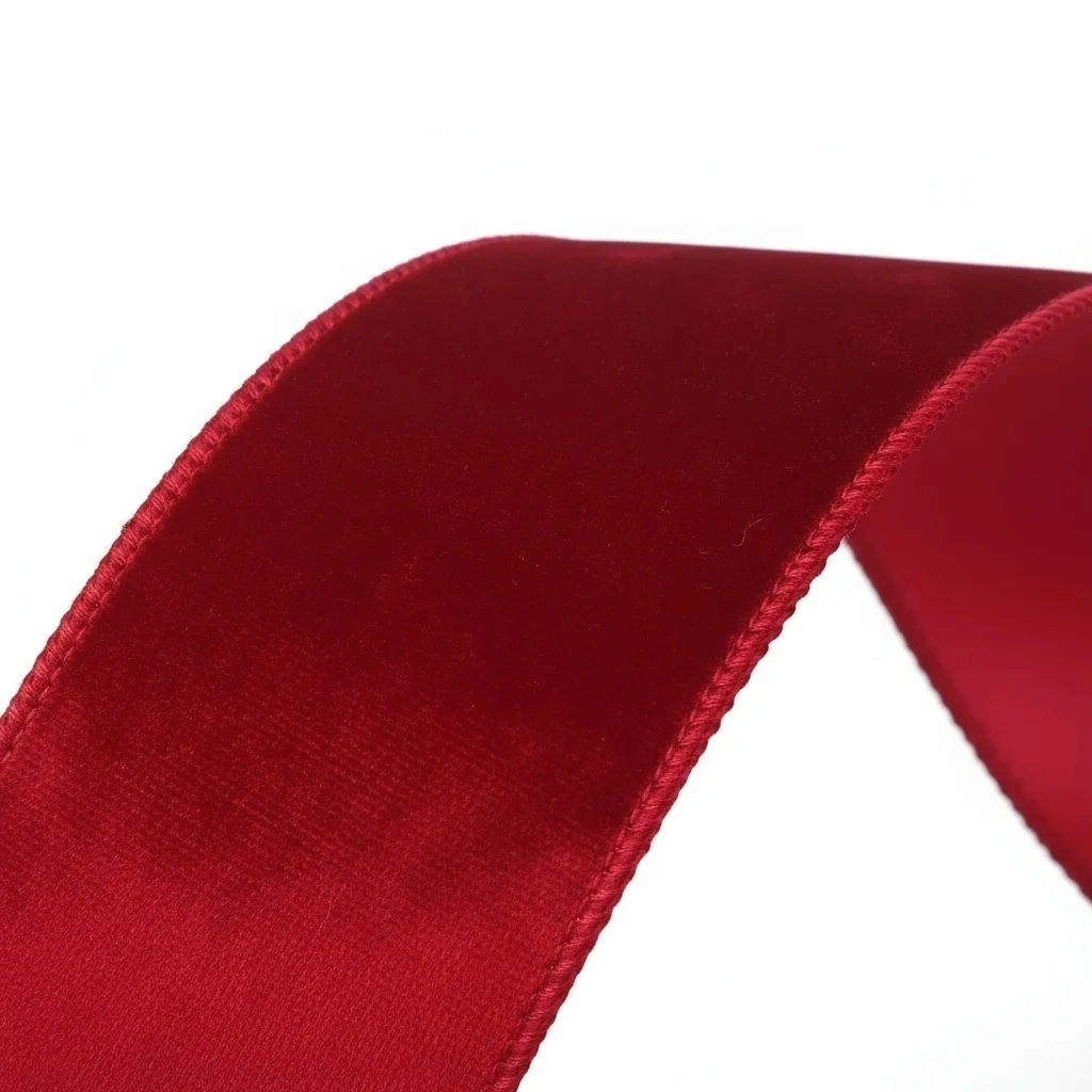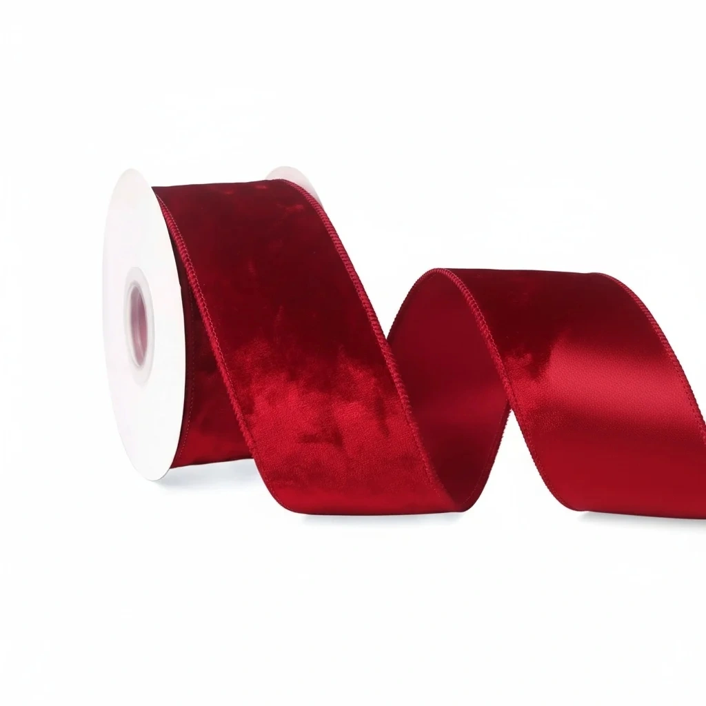 Premium red velvet wired ribbon crafted from polyester with a glossy crushed velvet face and a matching high‑density satin back. Double wired edges hold shapes for bows and displays. Supplied in continuous 10‑yard rolls without splices, 2.5‑inch width—ideal for Christmas décor, wreaths, and gift wrapping.