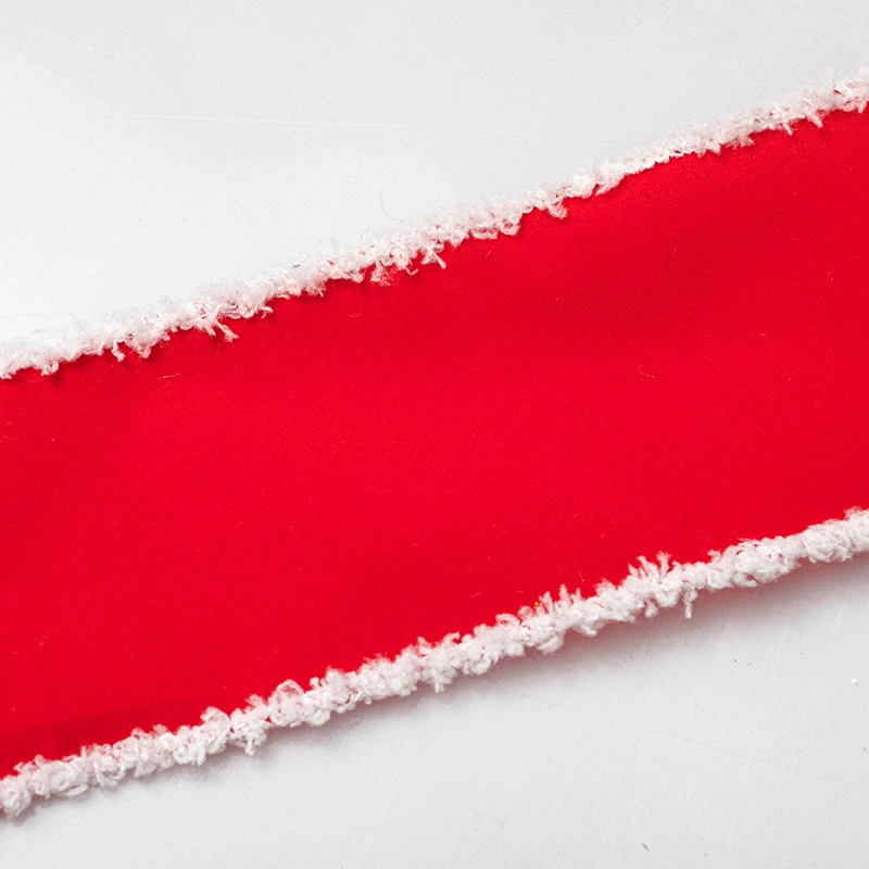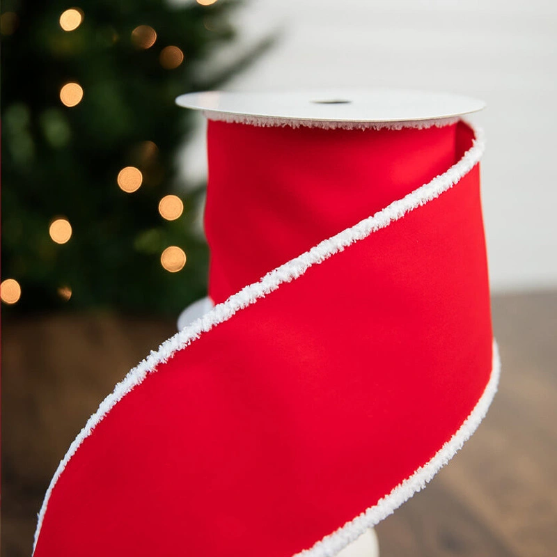 A: Our ribbon features luxurious white plush trim along both edges, creating a premium Santa-inspired look. The wire-edge construction allows for easy shaping and bow-making, while the velvet-like texture adds sophistication to any project.