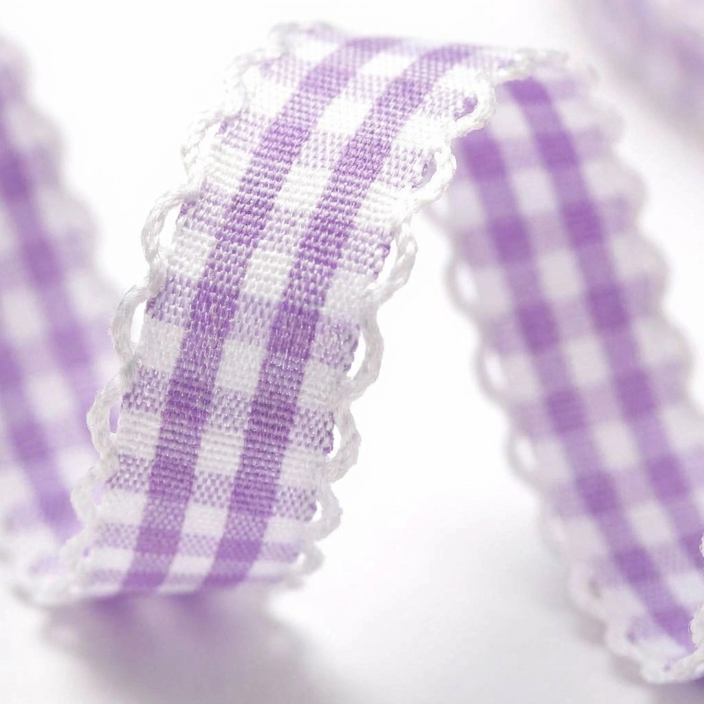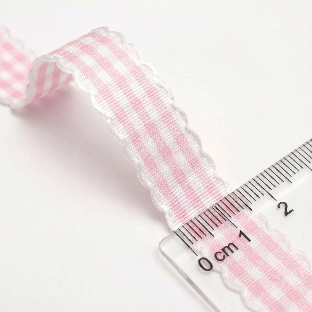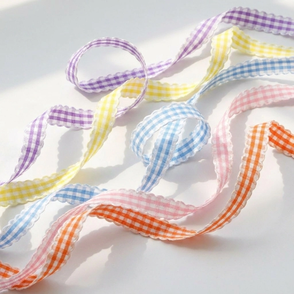 Our Pastel Gingham Ribbon features a charming 1cm width with distinctive double scalloped edges, creating an elegant ruffled appearance. Available in six delightful colors—lavender purple, peachy orange, soft pink, butter yellow, sky blue, and coral red—each shade embodies the trending macaron color palette that customers adore.